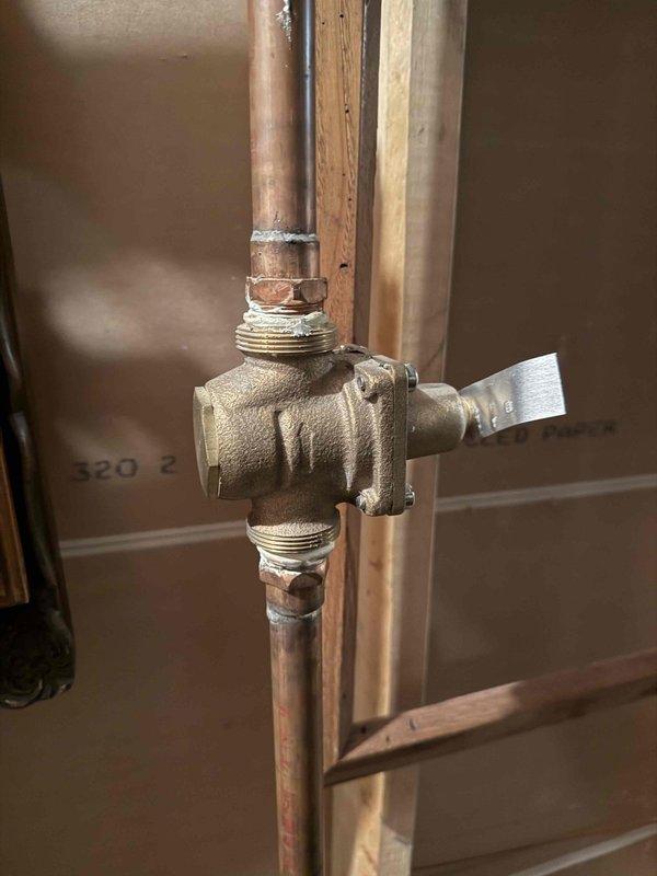Responded to water leak in basement workshop area with slow drip from exposed overhead piping. Upon inspection, identified leak source at brass valve junction fitting connecting copper pipe runs. Tightened threaded connections at valve body and verified all compression fittings were properly seated. Tested system under pressure to confirm leak was eliminated and no additional moisture was present. Advised homeowner to monitor area for any recurring issues.